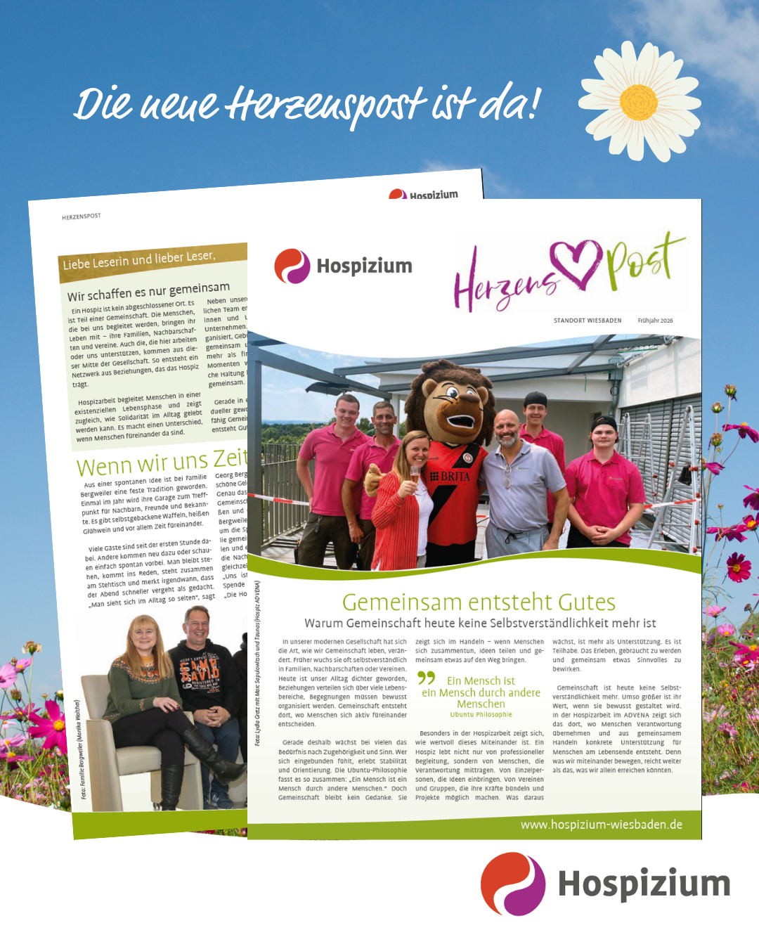 Wenn Sie regelmäßig unsere Herzenspost erhalten möchten, senden wir Ihnen gerne ein Exemplar zu - digital oder per Post. Bestellen Sie ihr persönliches Exemplar bei Christine Göbel, Tel: 0611-97620-22, Email: christine.goebel@hospizium-stiftung.de