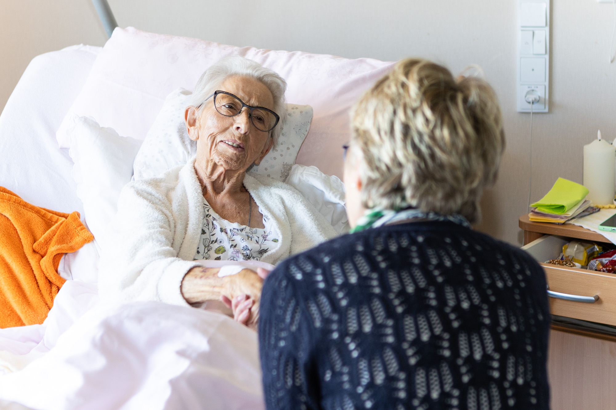 Gerne können Zugehörige schon im Vorfeld der Aufnahme persönliche Gegenstände wie Bilder oder Blumen in das Zimmer stellen und es entsprechend individuell gestalten. Anschließend erklären wir Ihnen den Hospizvertrag sowie weitere notwendige Regularien für den Aufnahmetag.